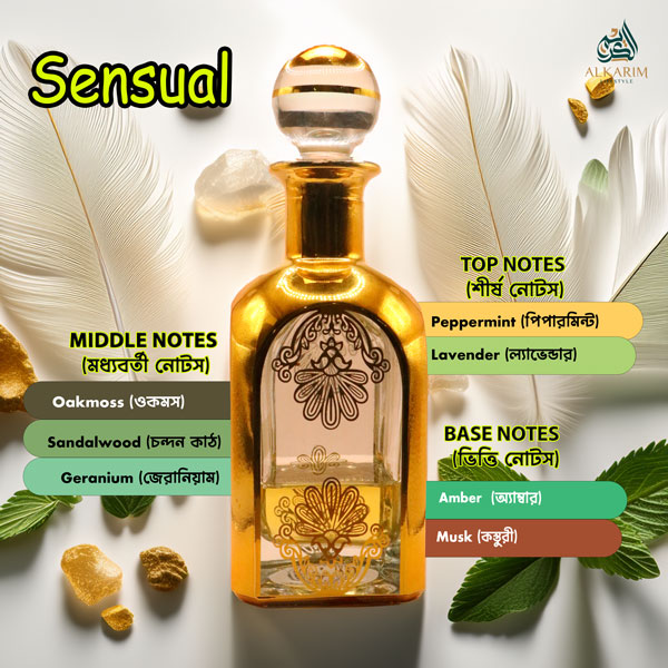 Sensual – পেপারমিন্ট (Peppermint), ল্যাভেন্ডার (Lavender), ওকমস (Oakmoss), চন্দন কাঠ (Sandalwood), জেরানিয়াম (Geranium), অ্যাম্বার (Amber) ও কস্তুরীর (Musk) এক সতেজ, শান্ত ও সংবেদনশীল মিশ্রণে তৈরি ইসলামিক সুগন্ধি।
