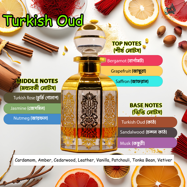 - ভিত্তি নোট (Base Notes): তুর্কি উদ (Turkish Oud - কাঠ), চন্দন কাঠ (Sandalwood), কস্তুরী (Musk)